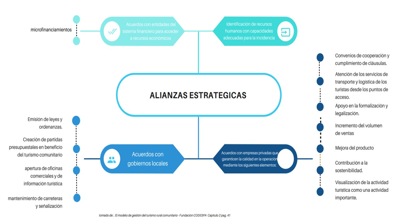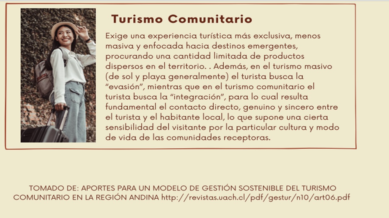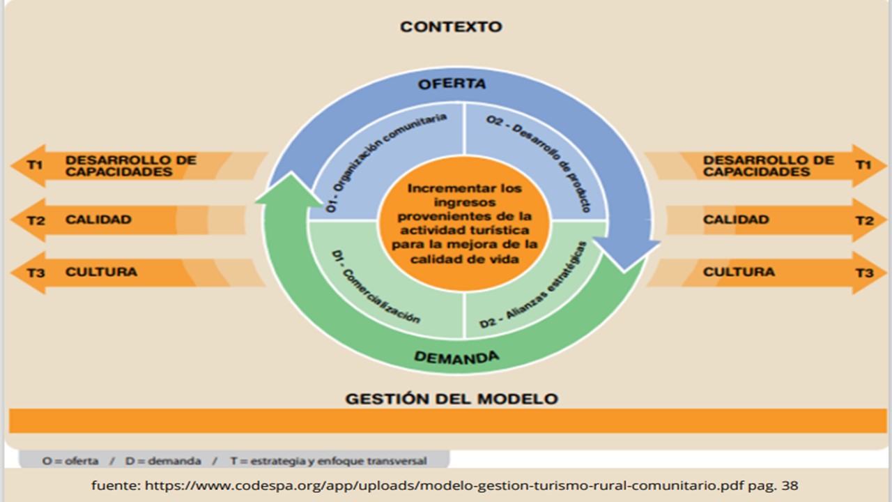 Un Modelo de Gestión Sostenible de Turismo Comunitario debe considerar primeramente que esta modalidad de turismo forma parte del Turismo Rural y que a su vez se enmarca en un modelo integrado de desarrollo turístico. La especificidad más importante del turismo comunitario es el control del producto turístico por parte de la comunidad (o comunidades), lo que implica que todas las decisiones en torno al proceso de desarrollo del turismo comunitario son adoptadas por la comunidad en sus asambleas. El gran desafío en este ámbito es cómo hacer más eficiente al proceso de gestión comunitaria, que en general suele ocupar demasiado tiempo en la toma de decisiones. Otra distinción es que el turismo comunitario no sólo considera una visión mercantil-productivista de la iniciativa turística, sino también un manejo sostenible de los recursos y la responsabilidad con el entorno social. Aquí también hay un gran desafío, pues si bien el turismo comunitario va más allá del negocio (en el dinero no es lo más importante, según lo que manifiestan las propias organizaciones del Ecuador), éste debe cumplir con altos estándares de calidad, ser rentable económicamente y ser un producto competitivo en el mercado. De este modo, un proyecto de turismo comunitario debe ser capaz de generar un flujo de visitantes que aporte ingresos económicos interesantes para las comunidades locales. Tomado de: https://www.bing.com/